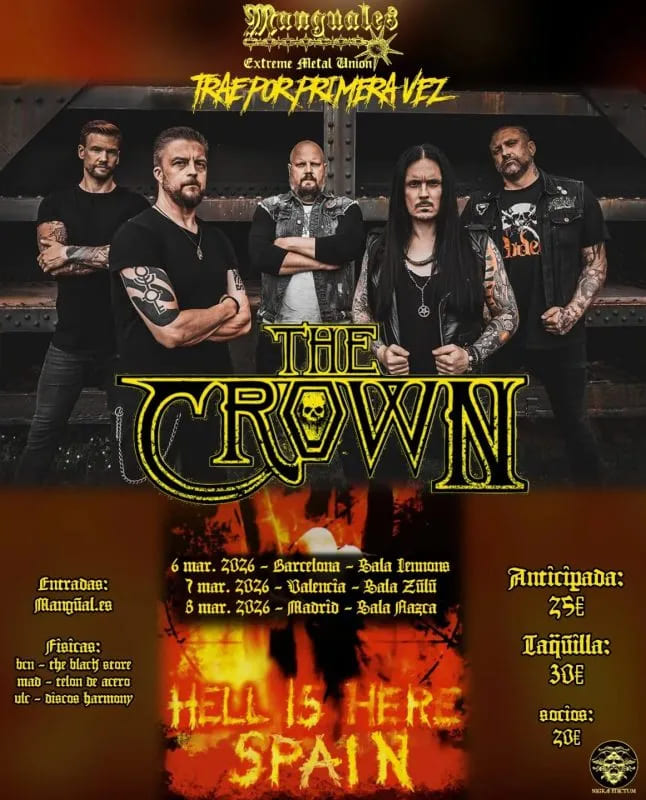 ¡Por fin! Uno de los nombres más respetados y abrasivos del Death–Thrash Metal mundial pisa por primera vez suelo ibérico. Tras más de tres décadas forjando su leyenda en las trincheras del metal extremo, THE CROWN ha confirmado tres fechas históricas en nuestro país para marzo de 2026. La banda sueca aterriza con una fuerza demoledora, presentando su nuevo álbum “Crown of Thorns” y revisitando una trayectoria tan letal como intachable.