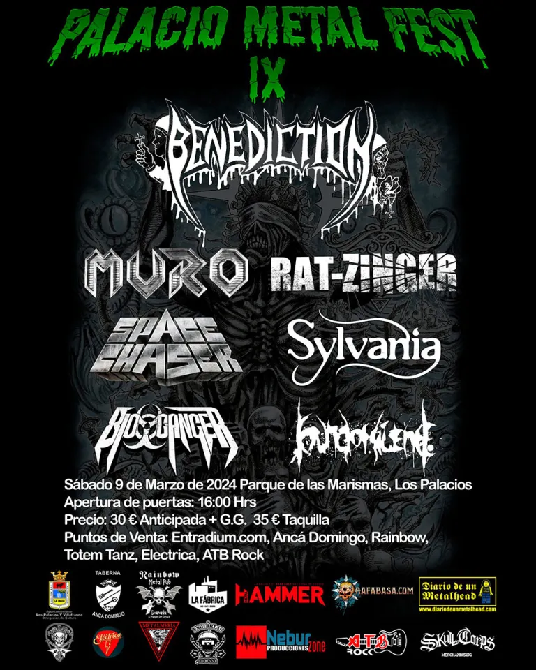 El cartel del IX Palacio Metal Fest cuenta con una variada selección musical, incluyendo a Rat-Zinger con su enérgico Punk Rock, Sylvania representando el potente Power Metal, Space Chaser de Alemania con Thrash Metal Old School, los legendarios Muro, Bio-Cancer de Grecia ofreciendo su genuino Thrash Metal, Sound Of Silence con su contundente Deathcore, y como cabeza de cartel, Benediction.