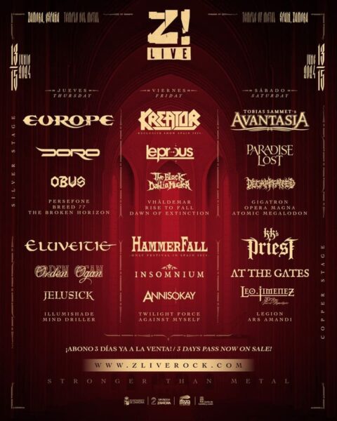 El festival también ha anunciado cambios en el cartel, con Persefone tocando el 15 de junio en el Copper Stage y Legion pasando al día 13 de junio en el escenario Silver. El Z! Live Rock Fest 2024, que se celebrará en el Recinto Ferial IFEZA del 13 al 15 de junio, cuenta con un impresionante line-up que incluye a Europe, Eluveitie, Doro, Orden Ogan, Kreator, HammerFall, Leprous, Insomnium, Avantasia, KK’s Priest, Paradise Lost, Decapitated, entre otros.
